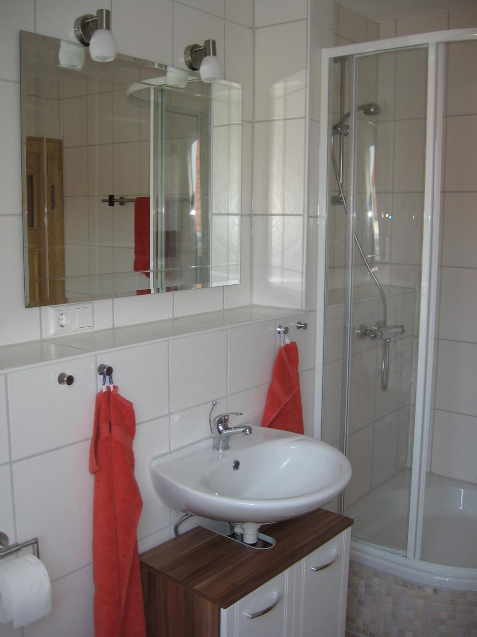 Im Bad mit Dusche stehen auch Fön, Waschmaschine und Trockner bereit.